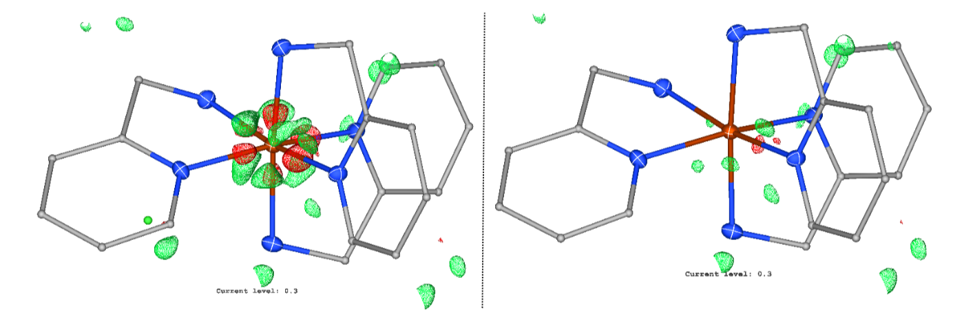 Residual density map of an iron(II) complex after HAR based on a high-spin density (left) and low-spin density (right), only selected atoms are shown for clarity (red: iron, blue: nitrogen, grey: carbon).