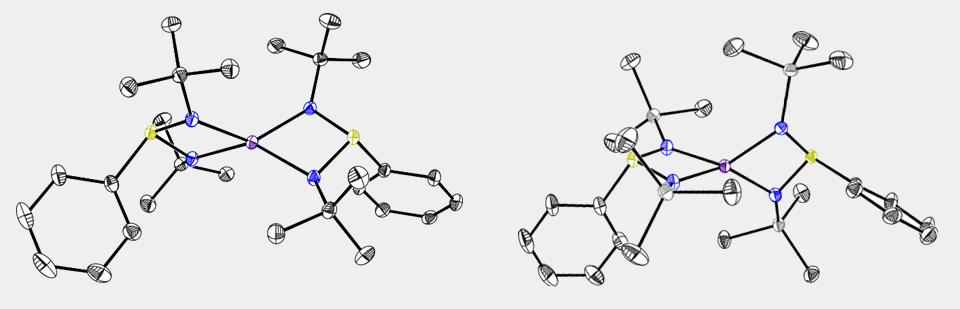 The complexes, one the left with tBu groups, and on the right with tms. Anisotropic displacements are depicted on a 50% probability level, hydrogen atoms are omitted for clarity.