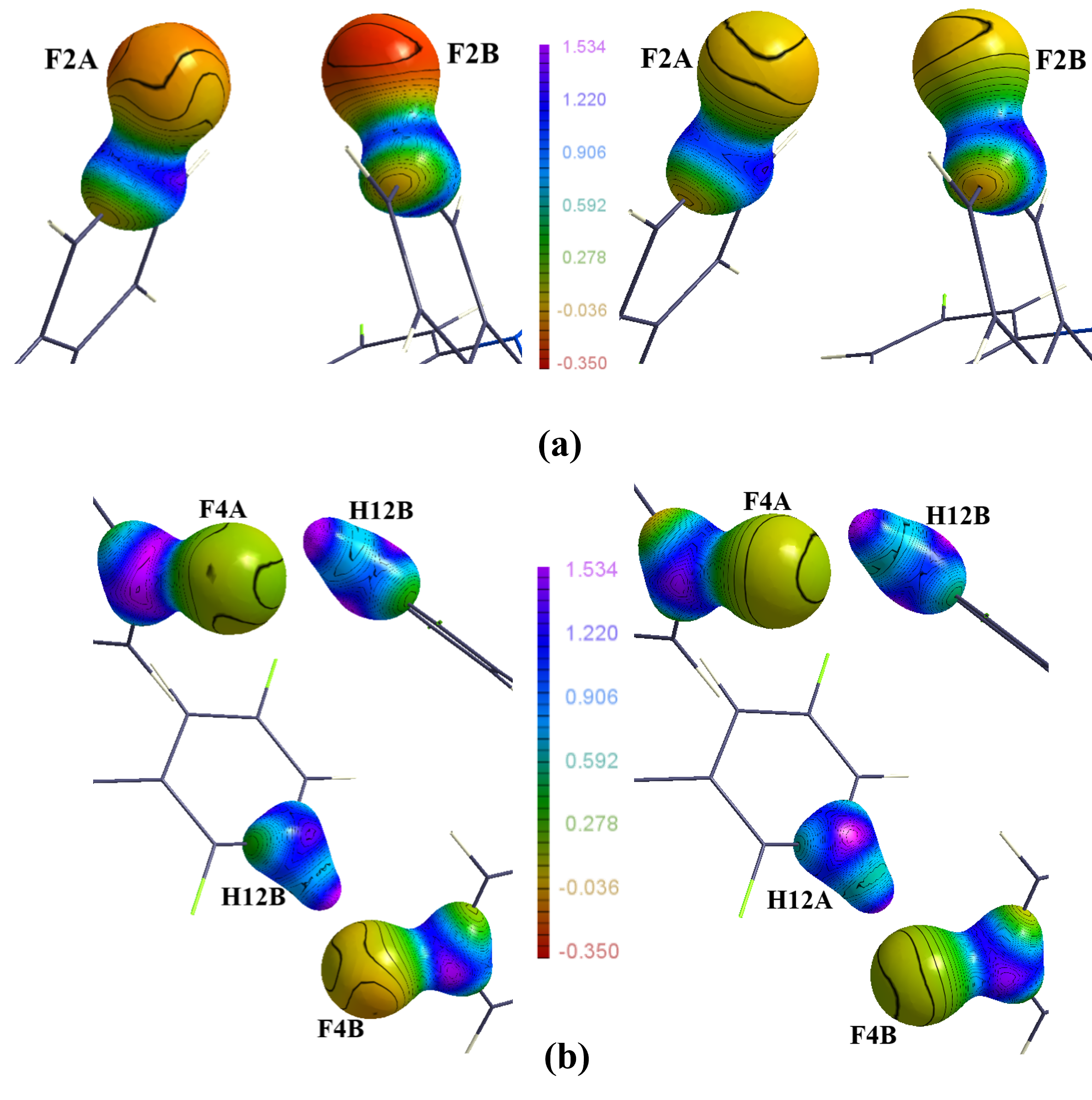 3D Electrostatic potential plots highlighting the C–F⋯F–C interactions (left experimental, right theoretical).