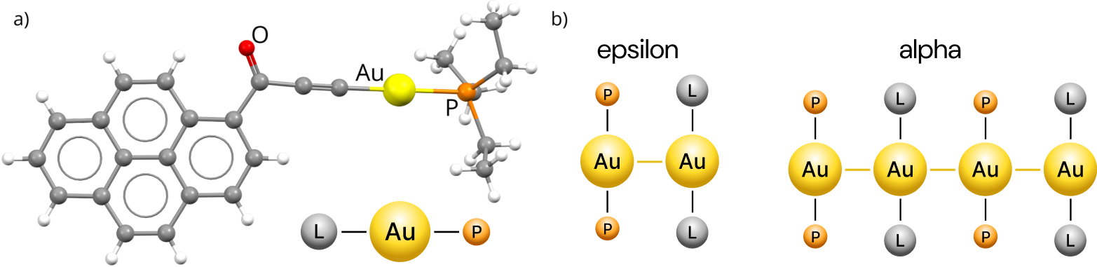 1-(pyren-1-yl)-prop-2-yn-1-onyl)-(triethylphosphine)-gold(I) a) Formula b. Schematic structures of alpha and epsilon isomers.